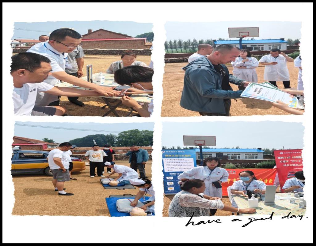此次社会实践活动的对象是位于龙江县小聚宝村的村民,村与村的路四通八达,交通便利,即使是雨后的道路也没有泥泞。志愿服务队驱车从县里行驶35分钟到达了小聚宝村,此次“三下乡”专项活动中思政教学部与健康护理系共计7位指导教师与9名护理专业学生参与。活动中,指导教师和学生们为40名老年人量血压、测血糖,评估身体状况;现场宣讲健康防护的基本知识16条,并由护理221班的关雅丹同学为村民示范人工呼吸、心肺复苏等3项应急抢救措施;通过现场疾病问诊答疑,发放调查问卷等方式使村民们对自己身体状况的预判以及预防疾病能力都有了提高。