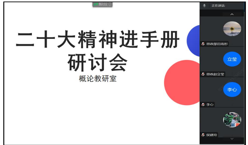 2月1日至2日,思政教学部在线召开专题教研会,研讨如何更好地将党的二十大精神融入各门课学习手册之中。党支部书记赵婷婷、副主任李娜与各门课课程长积极组织教师深入学习文件精神及党的二十大相关教辅材料。教研会旨在进一步落实 《伟德国际victor1946关于做好党的二十大精神进教材工作的通知》文件要求。