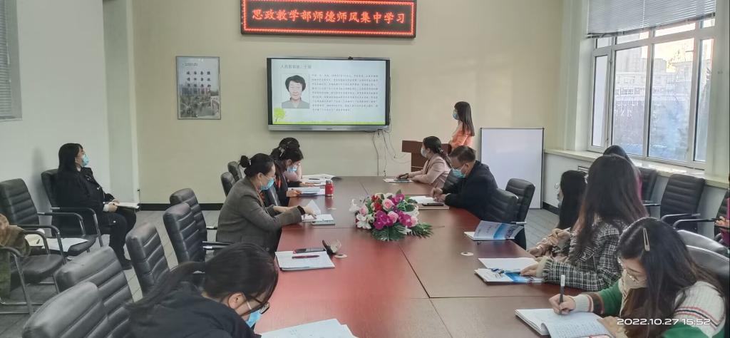2022年10月27日下午,在3教1211会议室,思政教学部开展了《师德优秀先进事迹》学习活动,全体教师参加,会议由杜香丽老师领学。