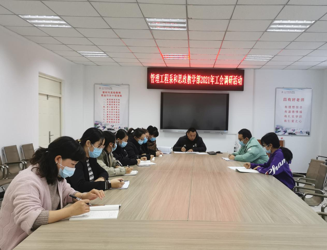 11月10日下午15:30分,思政教学部基层工会和管理工程系基层工会在2号教学区2209会议室组织进行了调研活动,文体部长杨忠林、思政教学部基层工会主席陈丽君及相关教职工代表参加了此次调研。