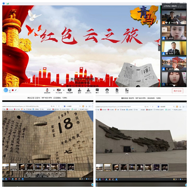 5月23日上午,思政教学部指导青马学会开展“红色云之旅”线上参观活动,青马学会干部和部分2019级学生共47名,通过VR云“来到”九•一八历史博物馆进行参观。在参观九•一八纪念碑、国难浮雕和皇姑屯事件、发动侵华战争、林海雪原等展厅的过程中,同学们重温了我东北军将士和人民奋起抗日的英雄壮举,激励自己不忘历史,爱党、爱国、爱人民、爱社会主义,在学习、工作、生活中展现当代大学生的责任与担当。思政教学部副主任邵奇在活动总结中,希望同学们在后续的线上线下学习中,刻苦上进,努力成为有理想、有本领、有担当的时代新人。