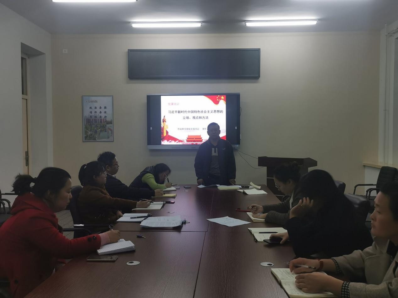 根据学院开展“不忘初心、牢记使命”主题教育的总体部署及思政教学部党支部主题教育的工作安排,10月25日下午,思政教学部党支部书记魏军以《习近平新时代中国特色社会主义思想的立场、观点和方法》为题,为思政教学部全体教师上了一堂非常生动、很有教育意义的专题党课。