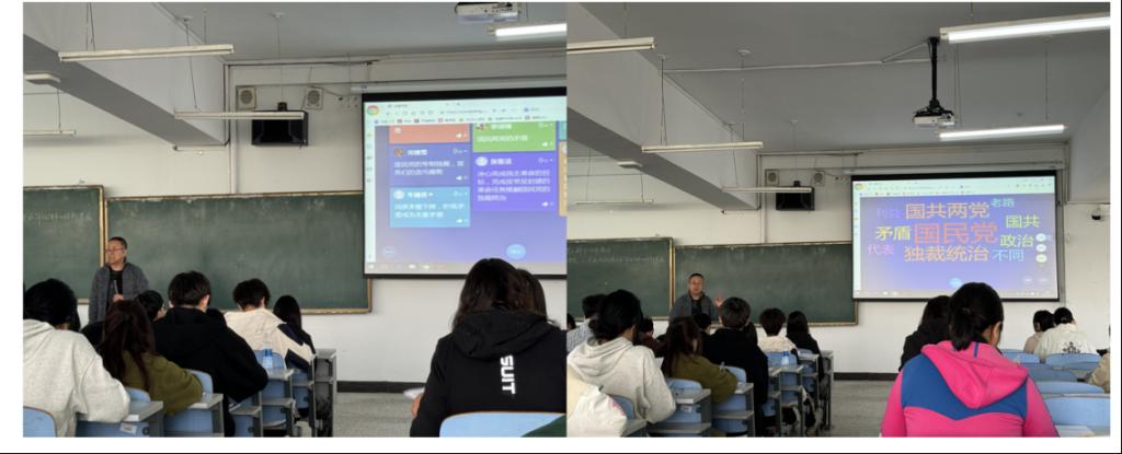 本次观摩课授课班级为大数据231、视觉231班,授课内容为课点32全面内战爆发和解放战争的胜利发展,授课过程中重点突出问题导向与学习通数智化的有机融合,以“中国共产党为什么能赢得解放战争的胜利?”为主线问题开展教学,课前布置预习任务,并观看“这就是中国”视频节选,思考全面内战爆发的原因是什么?通过学习通进行头脑风暴、互动问答进行重难点讲解,教学设计中的“212”汇报“中国共产党为什么能够赢得解放战争的胜利?”的内容与专业实践学期的案例故事自然衔接,承上启下,重点突出。同时在学习通上又进行了习题抢答,讲练结合,及时反馈,效果良好。