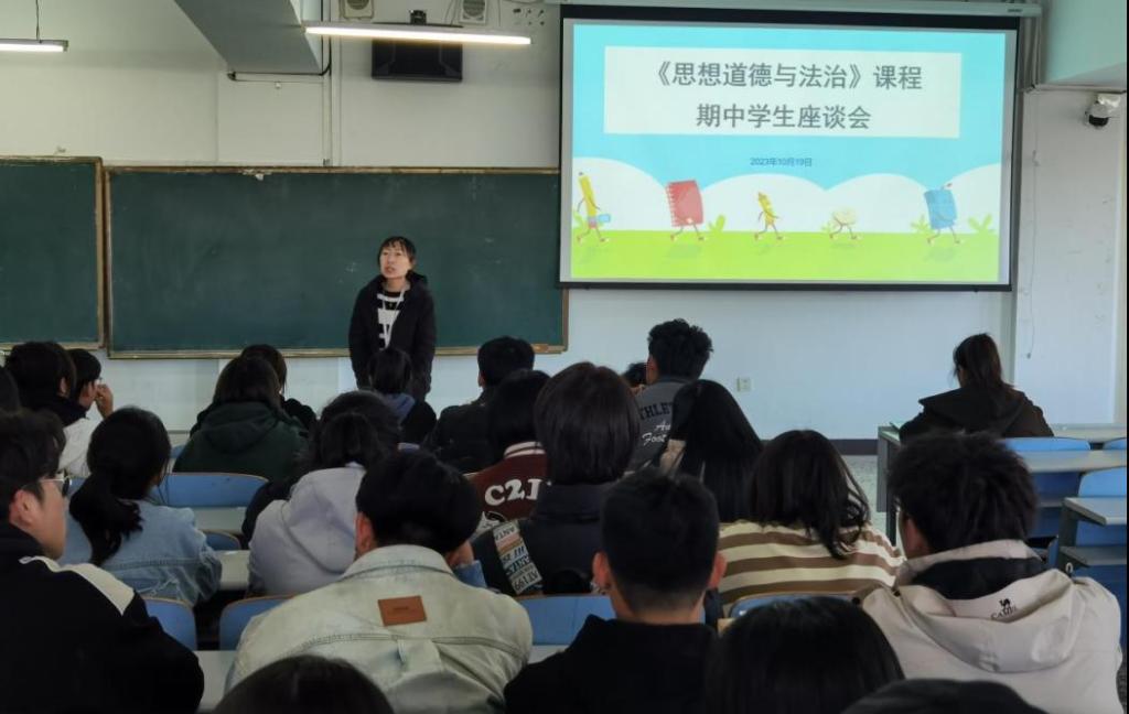 为更好地落实“以学生为中心”的育人理念,提高《思想道德与法治》课程教学质量和管理质量,提升学生对思政课的获得感,10月19日中午,基础教研室在图书馆201教室组织召开《思想道德与法治》课程期中学生座谈会。会议李心老师主持,教研室全体教师和2023级各班学生代表参加座谈会。