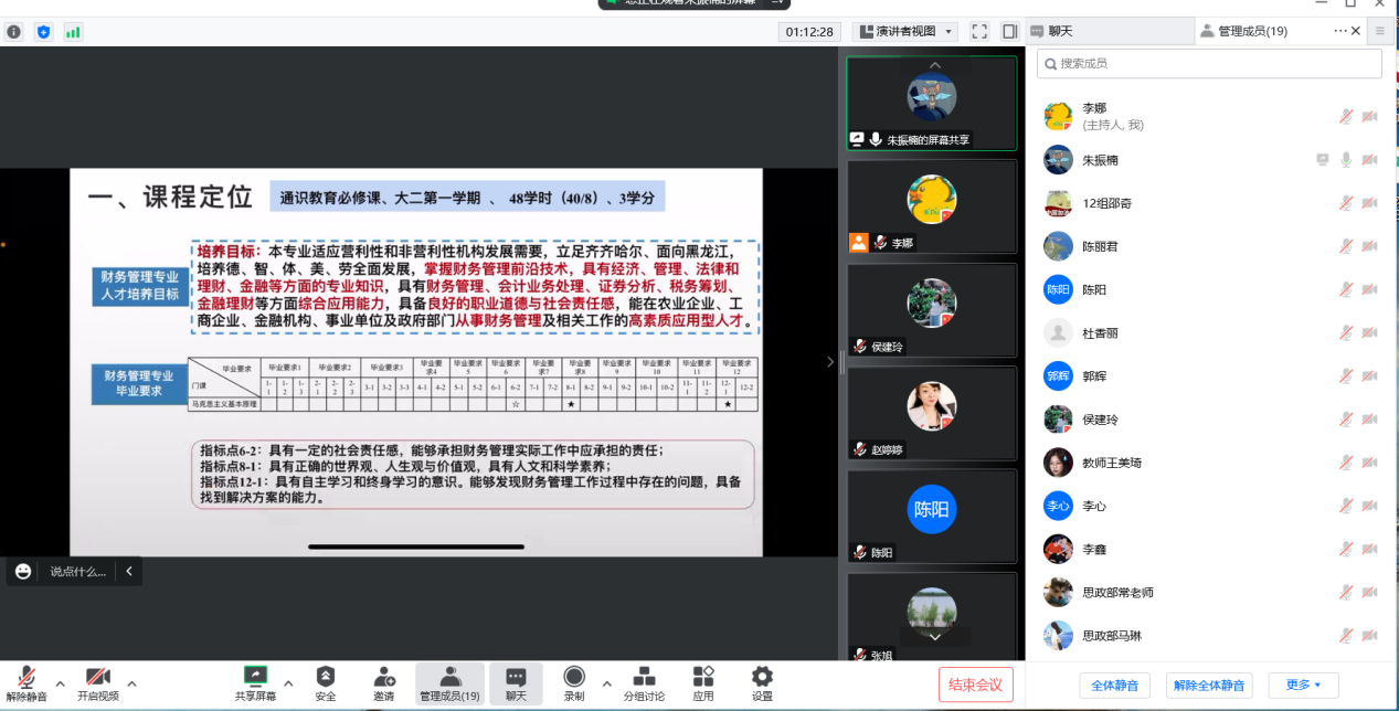 12月23日晚,思政教学部组织开展了本学期特色课程交流汇报活动,思政教学部全体教师参加,教学副主任李娜主持本次活动。