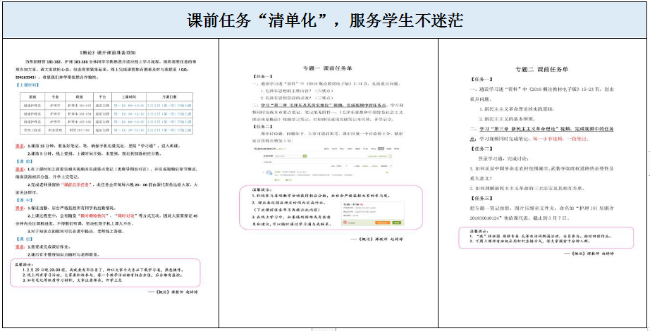 线上开课前,根据思政教学部教学准备会议要求及概论教研组研讨,明确课程育人、课程内容、课程改革依然为思政部教师努力的方向。因此,在兼顾三个“方向”的同时,要以学生为中心,引导学生顺利完成线上学习的心态转变,在各课程线上授课全面开展的压力下,帮助并服务学生明确《概论》线上“怎么学”,课前任务“清单化”,使学生课前不恐慌、不迷茫,清单操作,流程明确。