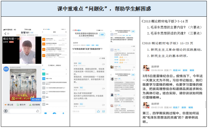 通过研讨,我们选用了首都师范大学李松林老师《毛泽东思想和中国特色社会主义理论体系概论》慕课资源让学生进行在线视频学习。同时,我们每周为学生进行固定时间的线上直播教学,在宝贵的45分钟内,为学生提炼重点、解答难点、明确要点,即以问题为导向,围绕问题将重点、难点、要点贯穿,充分发挥好“战疫思政小课堂”的作用,让学生听得更加明白。例如:专题一设置问题【毛泽东作为中国无产阶级革命的第一代领袖,他的卓越贡献有哪些?】在回答这一问题的过程中,就把毛泽东思想的形成和发展、毛泽东思想的主要内容和活的灵魂以及历史地位等知识点串联起来。在互动过程中,通过选人、连麦、文字回复等形式进行,在思考、回答问题的过程中内化新知,从而解决,有限时间、内容繁杂、囫囵吞枣的学习状态。