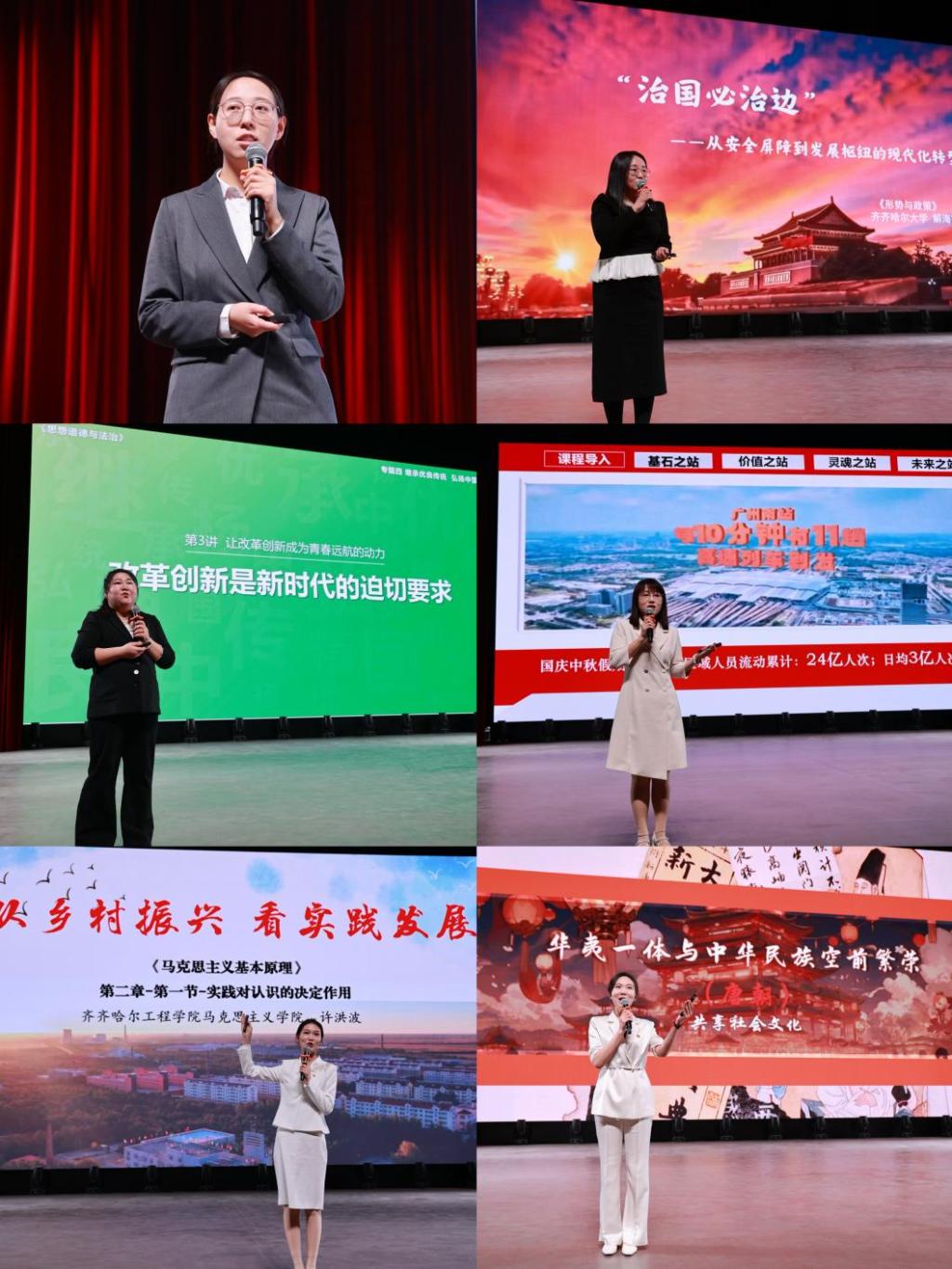 在教学展示环节,来自片区各高校的六位思政课教师依次登台,展现了扎实的教学功底与创新的教学思路。齐齐哈尔理工职业学院管锡铭老师以《中国精神的丰富内涵》为题,系统阐释民族精神与时代精神的核心要义;齐齐哈尔大学解海霞老师聚焦《“治国必治边”—从安全屏障到发展枢纽的现代化转型》,结合黑龙江边疆建设实际深入解读国家发展蓝图;齐齐哈尔医学院霍然老师围绕《改革创新是新时代的迫切要求》,传递新时代奋进力量;黑龙江交通职业技术学院杨洋老师立足行业特色,围绕《钢轨延伸复兴路 实干铸就现代化》实现思政教育与专业学习有机融合;伟德国际victor1946许洪波老师以齐齐哈尔兴十四村为样本,讲授《从乡村振兴看实践发展》,让马克思主义基本原理扎根地域实践;齐齐哈尔高等师范专科学校王金趾老师通过《华夷一体与中华民族空前繁荣——(唐朝)共享社会文化》阐释中华民族共同体的历史根基。