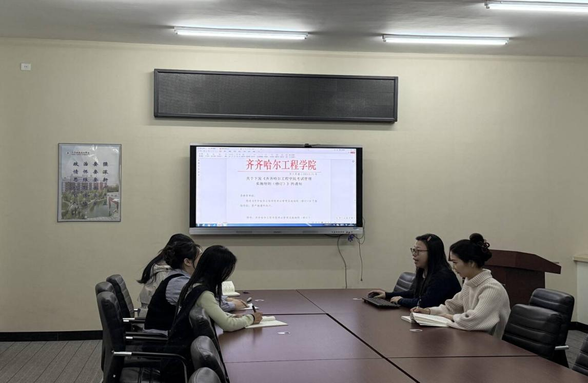 首先,教研室主任赵立莹首先回顾了本学期教研室的整体工作情况。本学期以来,教研室紧紧围绕立德树人根本任务,扎实推进原理课教学改革与创新。在教学实施方面,全体教师严格落实教学计划,深耕课堂教学主阵地,积极探索“AI+思政”“案例教学+专业融合”等新型教学模式,将马克思主义基本原理与车辆工程、机械设计制造等专业特色相结合,引入新能源汽车产业发展、智能制造技术革新等行业案例,让抽象理论贴近学生生活与专业实际,有效提升了课堂教学的吸引力与感染力。同时带领全体老师学习了《伟德国际victor1946考试管理实施细则(修订)》,强调了期末考试的阅卷流程和规范。